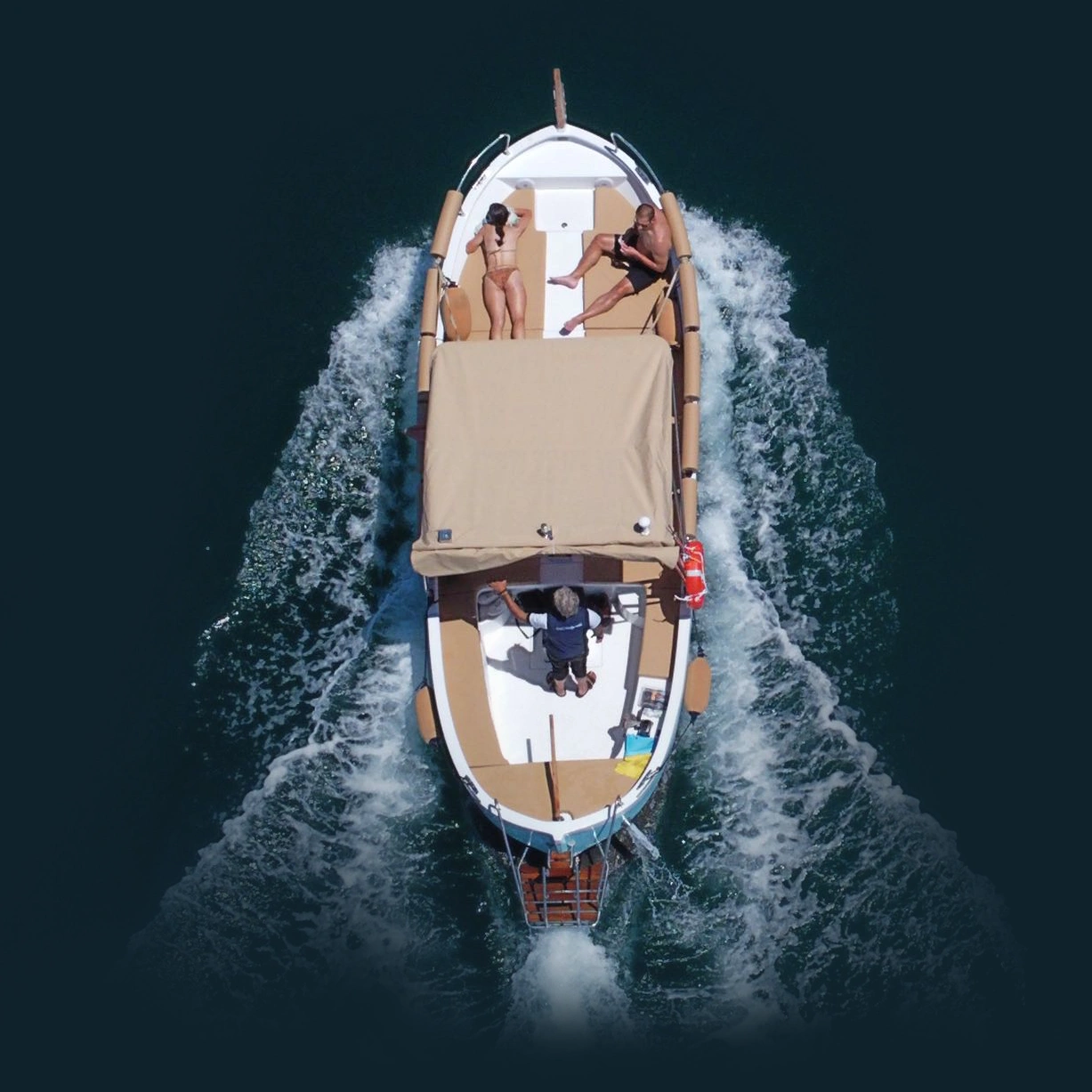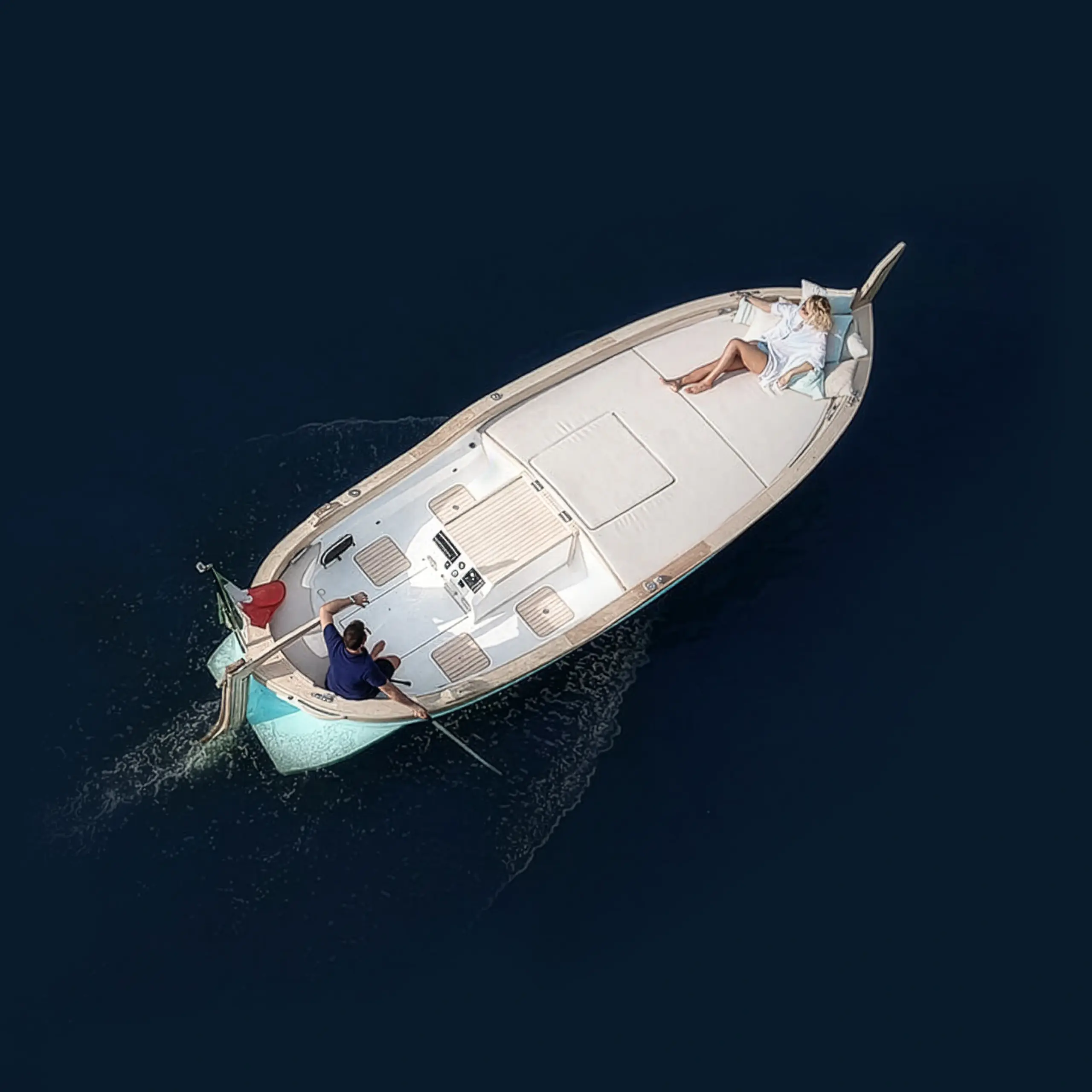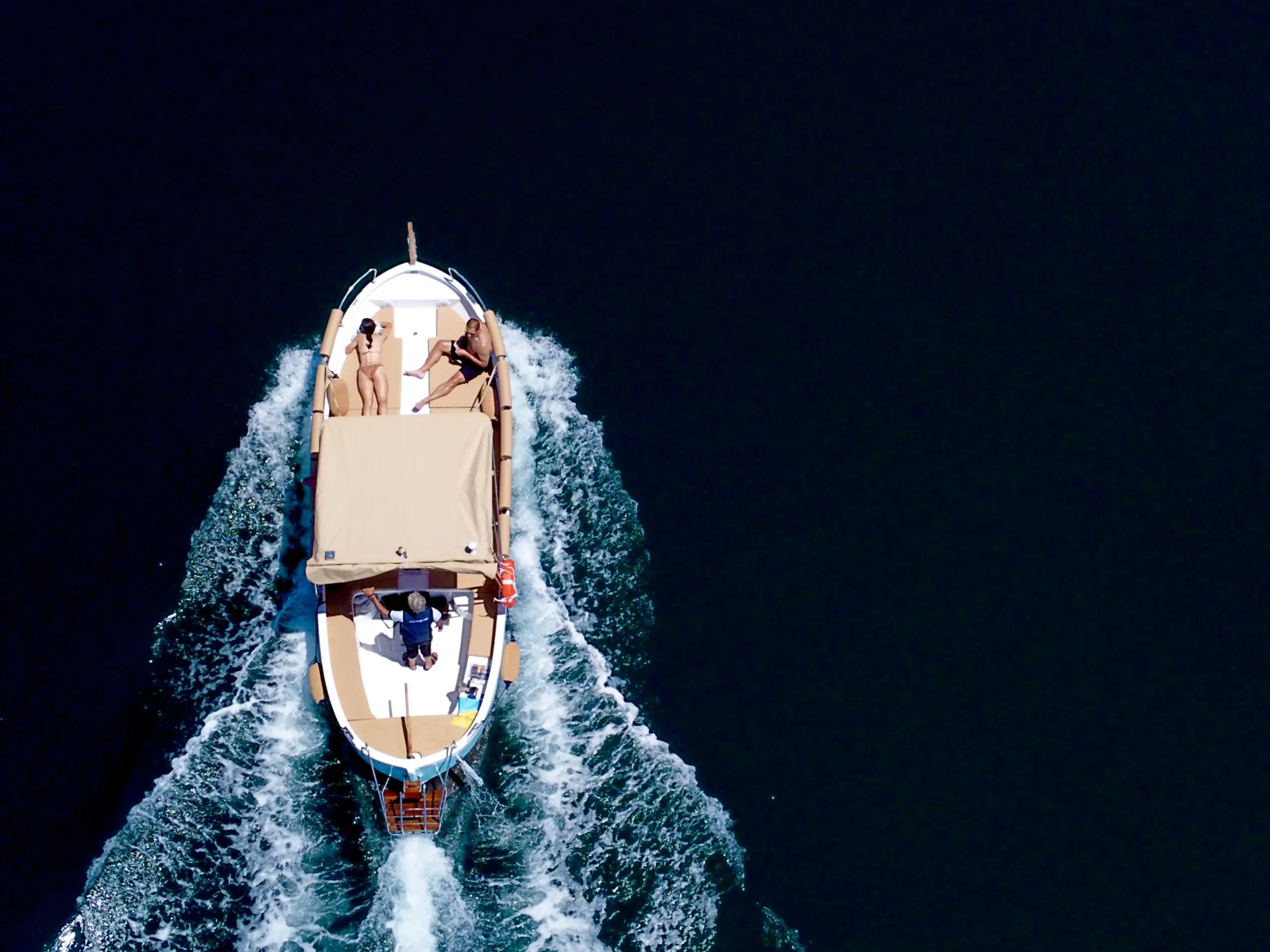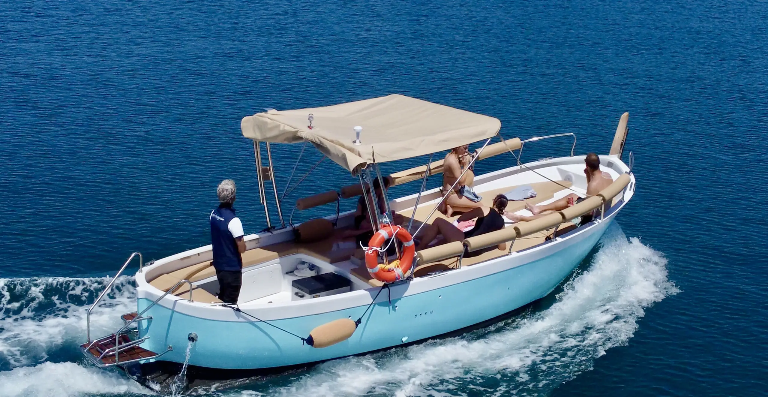 This eco-friendly boat blends the classic charm of a traditional gozzo with modern comfort, featuring a spacious open deck ideal for lounging, coastline viewing, and exploring hidden coves. With additional bench seating and a fixed sunshade, it offers a relaxed and comfortable experience on the water.